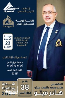 واستطرد "ميتو" قائلاً إن: ترشحه في انتخابات نقابة المهندسين المزمع عقدها في 23 من فبراير الجاري، ويحمل فيها الرقم"38" جاء بهدف، العمل على رغبته في تقديم خدمات مميزة تليق بمكانة زملائه من المهندسين وتعزيز الدور النقابي في خدمة المجتمع المهندس، موجهًا الدعوة لزملائه بدعمه في الانتخابات لاستكمال رحلة العطاء والعمل على تقديم الكثير لصالحهم.