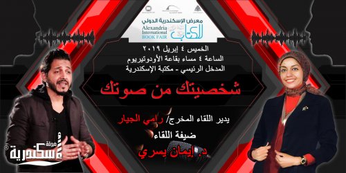 تستعد مكتبة الإسكندرية يوم الخميس القادم الرابع من ابريل 2019 في الساعة الرابعة عصرا ندوة ثقافية بعنوان "شخصيتك من صوتك" بقاعة الأوديتوريوم- المدخل الرئيسي بمكتبة الإسكندرية, فى اطار فعاليات البرنامج الثقافى لمعرض الإسكندرية الدولى للكتاب والتى يقدمها المخرج/ رامى الجيار وضيفة الندوة المدربة الصوتية د. إيمان يسري باحثة دكتوراه في علوم الصوتيات.