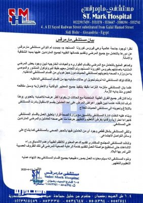 وأوضح القمص إبرام اميل، وكيل عام كاتدرائية الأقباط الأرثوذكس في الإسكندرية، أن هناك 5 حالات اشتبه في إصابتها بفيروس كورونا من داخل المستشفى، بينهم أحد أفراد الطاقم الطبي، وتم تحويلهم إلى مستشفى الحميات، وتبين إيجابية إصابتهم بالفيروس.