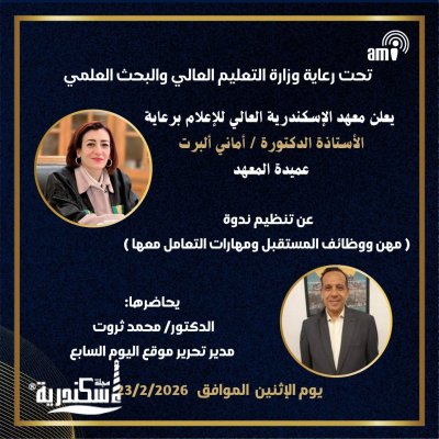 ينظم معهد الإسكندرية العالي للإعلام يوم الاثنين الموافق 23 فبراير 2026 ندوة تثقيفية بعنوان «مهن ووظائف المستقبل ومهارات التعامل معها»، وذلك برعاية عميدة المعهد الدكتورة أماني ألبرت، ويحاضر خلالها محمد ثروت مدير تحرير موقع اليوم السابع. تأتي الندوة في إطار التعاون مع الإدارة العامة لرعاية الطلاب – إدارة النشاط الثقافي بوزارة التعليم العالي والبحث العلمي، ضمن فعاليات الفصل الدراسي الثاني للعام الجامعي 2025/2026، وحرصًا على تعزيز وعي الطلاب بمتغيرات سوق العمل الإعلامي محليًا ودوليًا. وتهدف الفعالية إلى تسليط الضوء على أبرز المهن المستحدثة في المجال الإعلامي، واستعراض المهارات المطلوبة للتعامل مع التحولات الرقمية المتسارعة، إلى جانب تنمية قدرات الطلاب في التفكير الإبداعي، وبناء المهارات المهنية، والتكيف مع بيئات العمل الحديثة. كما تسعى الندوة إلى إعداد كوادر إعلامية مؤهلة تمتلك أدوات المستقبل، وقادرة على مواكبة التطورات التكنولوجية والمهنية، بما يعزز فرصهم التنافسية في سوق العمل ويواكب توجهات الدولة نحو دعم الاقتصاد المعرفي والتحول الرقمي.