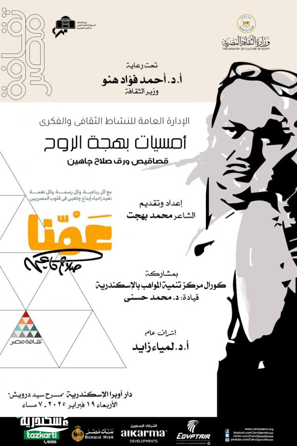 تحت رعاية الدكتور أحمد فؤاد هنو وزير الثقافة تتوالى فعاليات الوزارة للإحتفاء بأيقونات الإبداع المصرى حيث تعقد دار الأوبرا المصرية برئاسة الدكتورة لمياء زايد ضمن نشاطها الثقافى والفكرى ثلاث فعاليات ثقافية وفنية وشعرية تحت عنوان " عمنا صلاح جاهين " بالقاهرة و الأسكندرية ودمنهور تبدأ جميعها فى السابعة مساء الأربعاء ١٩ فبراير و تسلط الضوء على تراث الشاعر الكبير صلاح جاهين .